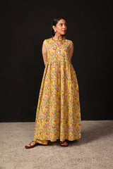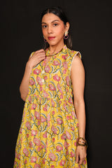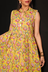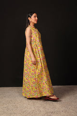 The serene grove of ruby fruit treasure – an A-line hand block printed dress featuring a band neckline with a graceful V-slit, enhanced with delicate button detailing. Featuring gathers at the waist and crochet lace detailing on the armhole, this sleeveless dress is perfect for the summer days.