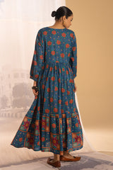 Floral printed tiered dress with a round neckline and a buttoned front placket. Soft gathers create a fluid, dancing flare that enhances the silhouette.