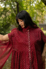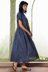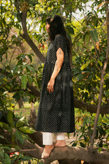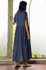 Indie Block front open dress with button details on placket. The dress has gathers on waist and turned up sleeves.
