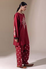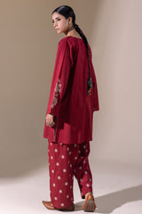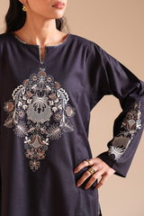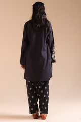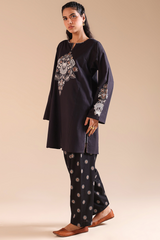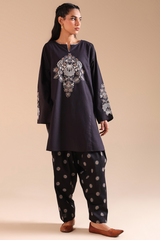 Embroidered classic-fit paneled shirt with a round neckline and V-slit, adorned with delicate stitching detail along the neckline and side slits. Paired with an embroidered classic-fit shalwar for an elegant, coordinated look.