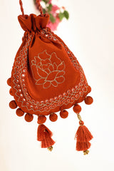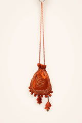 A delicate potli bag adorned with golden taanka phool embroidery, enhanced by intricate mirror work. The tasseled beads and tassel details add a playful charm, while the dori string ensures effortless carrying. A perfect blend of tradition and elegance for any occasion.