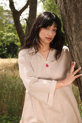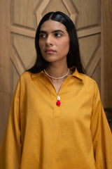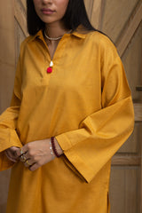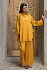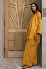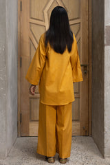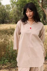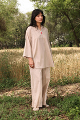 Solid co-ord set featuring a collared-neckline shirt with tassel detailing along the placket. Designed with drop shoulders, turn-up sleeve hems, and a rounded hemline. Paired with easy-fit trousers.