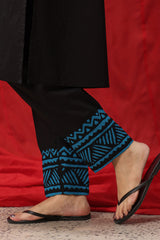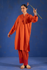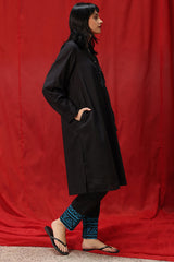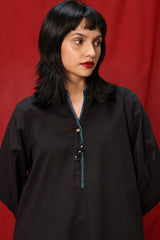 Hand-Crafted classic-fit shirt with a low band neckline and V-slit adorned with tassel detailing. Designed with subtle drop shoulders, cuffed sleeve hems, and side pockets for added comfort. Paired with straight-fit trousers featuring appliqué detailing along the borders.