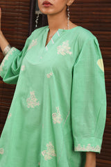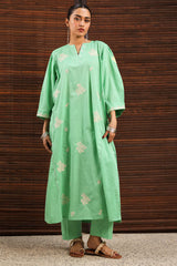 Embroidered classic-fit paneled shirt with a round neckline and a V-placket adorned with gota detailing. Designed with subtle pleats on the shoulders and embroidered sleeve hems featuring heart appliqué accents. Paired with straight-fit trousers.