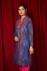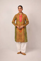 A straight-fit, paneled printed kurta in a jigsaw-style print, featuring a band neckline with a V-slit and cuffed sleeves