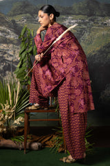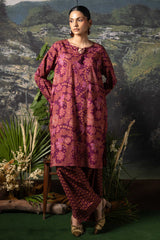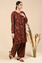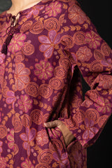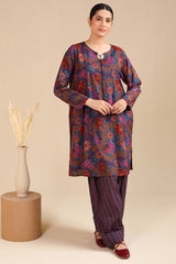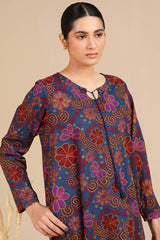 A classic-fit printed shirt with a round neckline and keyhole detail, adorned with tassel accents. Paired with printed farshi shalwar for a coordinated and stylish look.