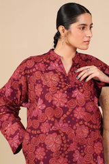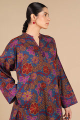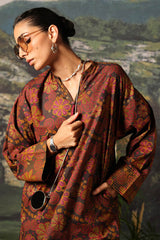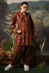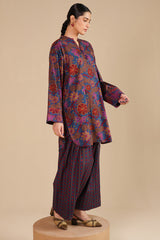 A classic-fit printed shirt with a low band and V-neckline, enhanced with tassel detailing. Side pockets add functionality and ease, while delicate stitching accents the sleeve borders. Paired with a complemented classic farshi shalwar, finished with detailed stitching along the borders.