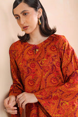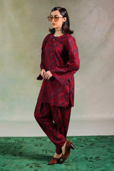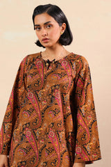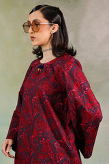 A deep classic-fit printed shirt with a round neckline and V-slit, adorned with tasseled detailing. Paired with matching printed classic-fit shalwar for a coordinated, stylish look.