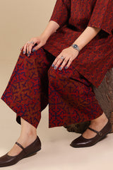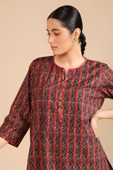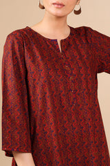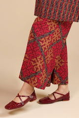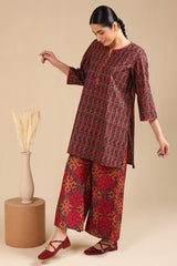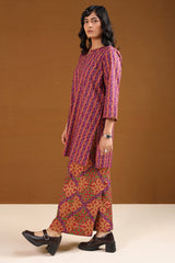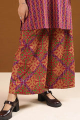 A classic-fit printed shirt with a round neckline and V-slit, featuring subtle mukaish detailing along the slit. Paired with complementing printed culottes.