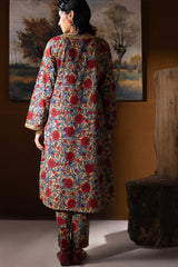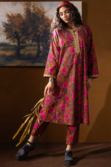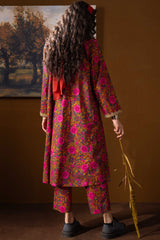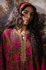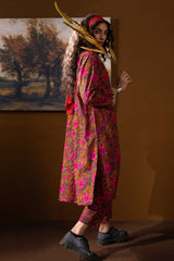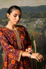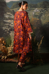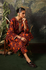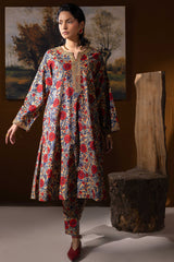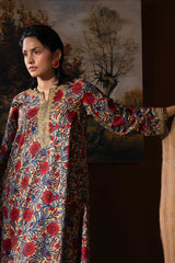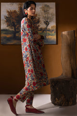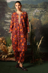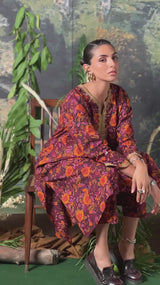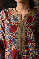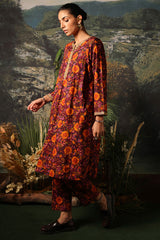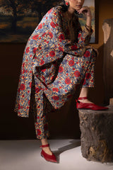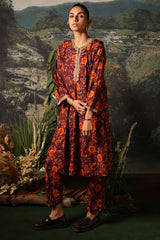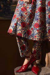 A vibrant floral printed A-line shirt with a round neckline and V-slit, adorned with delicate embroidery. The sleeve hems mirror the same embroidered detail. Paired with matching printed straight-fit trousers.