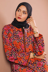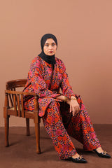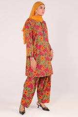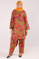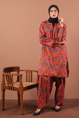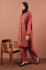 A classic-fit printed shirt with a round neckline and V-slit, adorned with subtle lace on the placket and sleeve hems. Paired with matching printed classic-fit shalwar featuring stitching detail on the ankle hemline for a coordinated, stylish look.