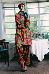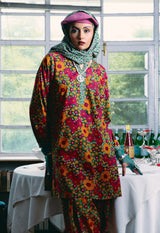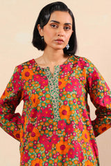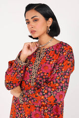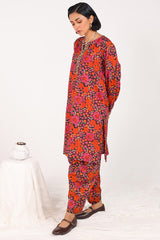 A relaxed-fit vibrant printed shirt with a round neckline and V-slit, featuring cuffed sleeves. Paired with matching printed classic-fit shalwar for a coordinated, stylish look.