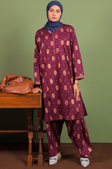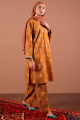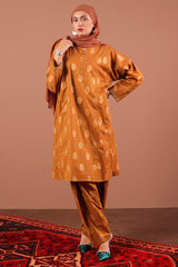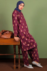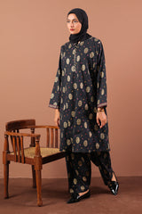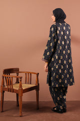 A relaxed-fit, paneled, gold-printed shirt with a round neckline, giving a refined luxe finish. Paired with matching printed classic-fit shalwar for a coordinated, stylish look.