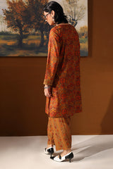A printed paneled kurta with a round neckline, adorned with delicate lace detailing on the front placket. The sleeve hems mirror the same lace accents. Paired with a printed classic-fit shalwar, finished with lace detailing.