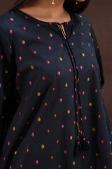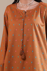 A relaxed-fit gold-printed A-line shirt featuring a keyhole neckline with tassel detail. Paired with a matching gold-printed gharara for a timeless, classic look.