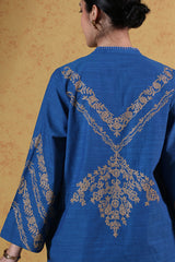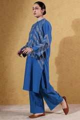 Embroidered classic-fit shirt with a low band neckline, adored with delicate stitching accents. Paired with classic culottes for a clean, refined look.