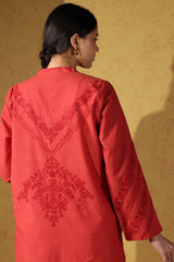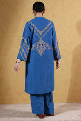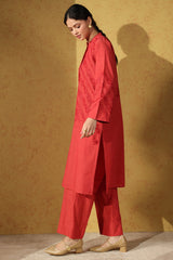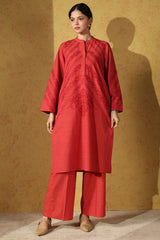 Embroidered classic-fit shirt with a low band neckline, adored with delicate stitching accents. Paired with classic culottes for a clean, refined look.