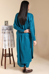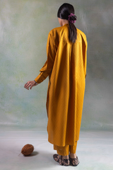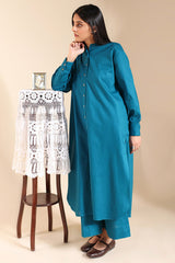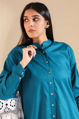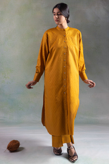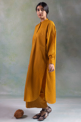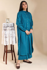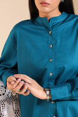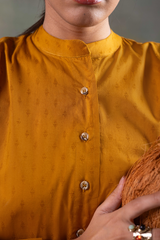 A classic-fit textured shirt with a low band neckline and button detailing along the front slit. Cuffed sleeves add structure, while the round hem and pleat detail at the back offer a relaxed finish. Paired with matching culottes for an effortlessly polished look.
