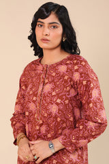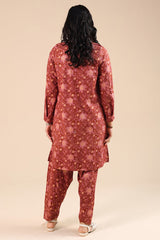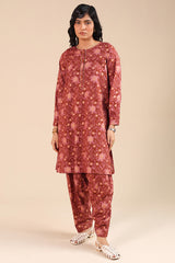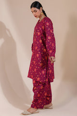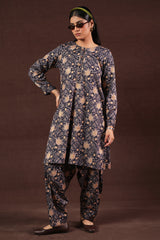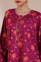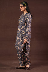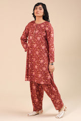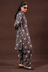 A classic-fit printed shirt with a round neckline and buttoned front placket, adorned with delicate embroidered details. Finished with cuffed sleeves and paired with a matching printed classic-fit shalwar.