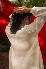 Angrakha-style embroidered shirt in soft mulmul muslin, adorned with tassel detailing along the slit. Soft gathers at the empire waist for a flared silhouette, complemented by cuffed sleeve hems. Comes with an inner for added comfort. Paired with a matching flared gharara.