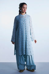 Embroidered classic-fit paneled shirt with a low band neckline and a buttoned front placket. Delicate self-embroidery is enhanced with gold panni work. Comes with an inner for added comfort and ease. Paired with a classic farshi shalwar.