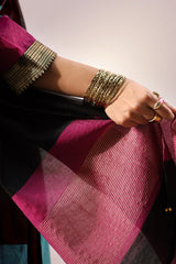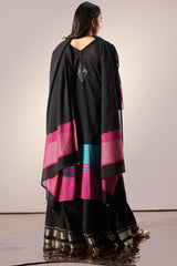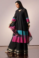 Classic-fit shirt adorned with a delicate floral motif embroidered at the back, designed with a soft V-neckline and accented with vibrant woven borders along the sleeves and hem. Comes with an inner for added comfort and ease. Paired with a flared sharara finished with traditional metallic detailing and a sheer dupatta that echoes the same bold accents.