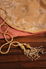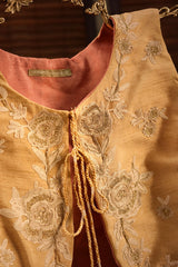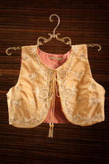 Embroidered classic-fit short, sleeveless koti with a round neckline, accented with delicate tassel detailing.