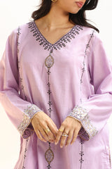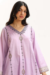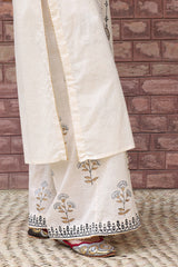 Hand-block printed classic-fit shirt with a V-neckline, adorned with gota lace detailing along the sleeve hems and side slits. Paired with coordinated printed culottes with gota lace detailing along the hemline.