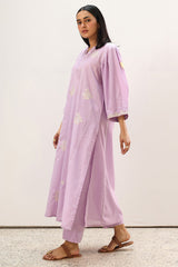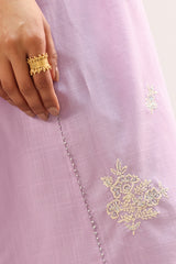 Embroidered classic-fit paneled shirt with a round neckline and a V-placket adorned with gota detailing. Designed with subtle pleats on the shoulders and embroidered sleeve hems featuring heart appliqué accents. Paired with straight-fit trousers.