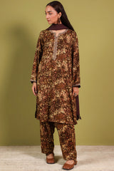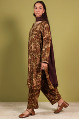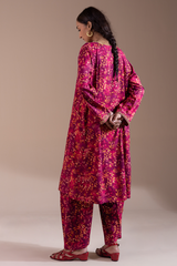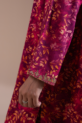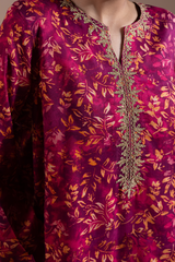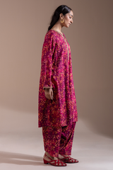 A classic-fit printed shirt with a round neckline and V-slit, adorned with delicate embroidered detailing along the neckline and sleeve hems. Paired with a matching printed classic-fit shalwar.