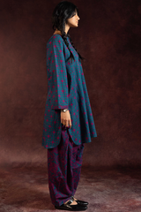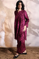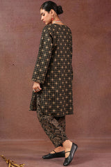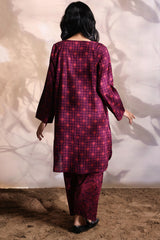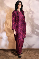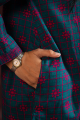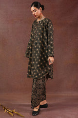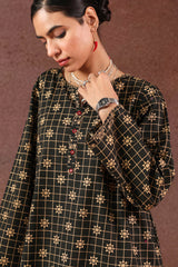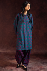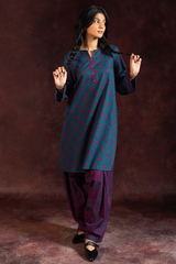 A classic-fit printed shirt with a round neckline and V-slit, adorned with subtle embellishments along the front slit. Finished with side pockets and a rounded hem. Paired with classic-fit printed shalwar for a coordinated look.
