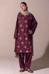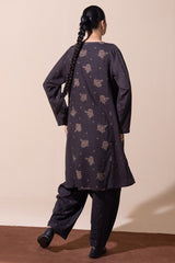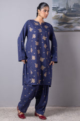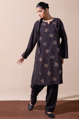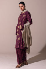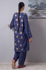 Classic-fit printed shirt with a round neckline and V-slit, adorned with delicate stitching detail. Paired with matching printed culottes for a relaxed yet refined look.