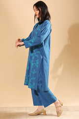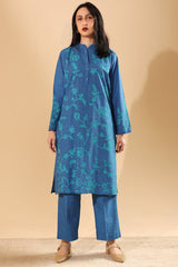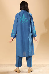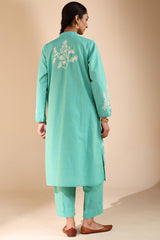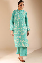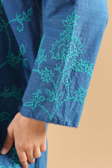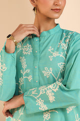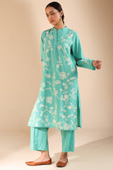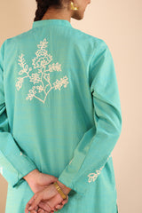 Embroidered classic-fit shirt with a low band round neckline, detailed with delicate bead embellishments along the sleeve hems. Paired with classic straight-fit trousers.