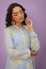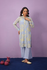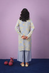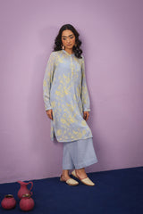 A well-fitted floral embroidered kurta featuring a band-round neckline and delicate button detailing along the front placket. Intricate gul motifs enhance its charm, adding a touch of refined artistry. Comes within inner (shameez) for added comfort and ease.  Paired with solid-hued, structured culottes for a sophisticated yet effortless look.