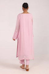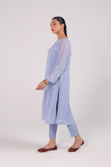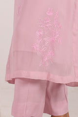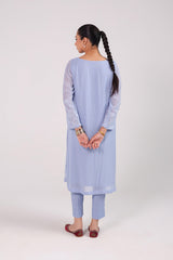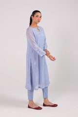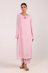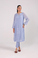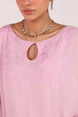 An embroidered shirt with a round neckline and keyhole detail, adorned with floral embroidery all over. Paired with straight-fit trousers for a refined and elegant look.