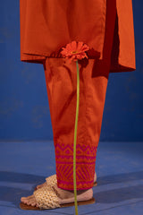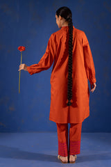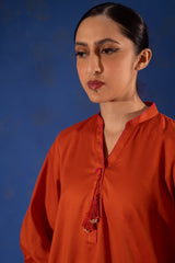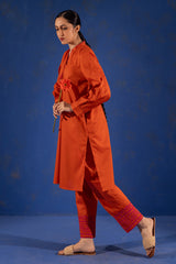 Hand-Crafted classic-fit shirt with a low band neckline and V-slit adorned with tassel detailing. Designed with subtle drop shoulders, cuffed sleeve hems, and side pockets for added comfort. Paired with straight-fit trousers featuring appliqué detailing along the borders.