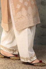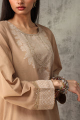 Woven in rich jacquard, this classic-fit shirt features a round neckline accented with dori embroidery and gota detailing around the neckline and sleeves. Paired with an embroidered classic-fit shalwar featuring jacquard borders, and subtle gota accents at the hem.
