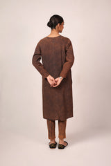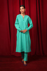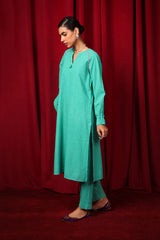 Exuding a laid-back charm, this solid-hued, relaxed-fit kurta features a band round neckline with a V-slit, elegantly adorned with tassel detailing. The vibrant pop of color on the shoulders adds a bold touch to the design. Paired with matching straight-fit trousers, this ensemble combines ease with contemporary flair.