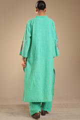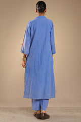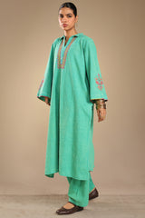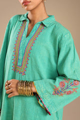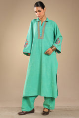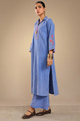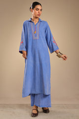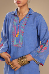 Embroidered classic-fit textured shirt with a collared neckline, adorned with tassel detailing on front placket and stitching accents along the sleeve hems. Paired with matching textured culottes.