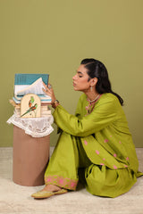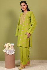Classic-fit paneled embroidered shirt with a round neckline and V-slit, adorned with crochet detailing and a softly rounded hem. Paired with a khula poncha shalwar featuring embroidery along the ankle hemline.