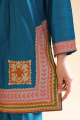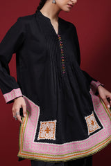 An appliquéd flared shirt with a low band neckline and loop detailing along the front slit. Designed with delicate pleats on the bodice and appliquéd accents on the sleeve hems and shirt border. Paired with a classic-fit shalwar featuring an appliquéd hemline.