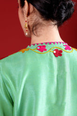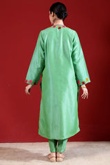 Embroidered straight-fit shirt with a round neckline and subtle V-slit, adorned with vibrant yet delicate floral embroidery that creates a striking visual statement. Paired with straight-fit trousers, finished with refined piping details for a polished, formal look.