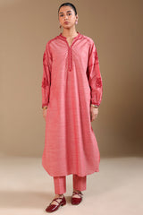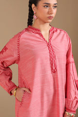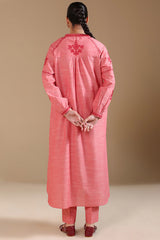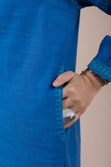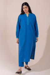 An embroidered relaxed-fit shirt with a low band neckline and V-slit, adorned with delicate embroidery. Designed in a drop-shoulder style with cuffed sleeves and side pockets for ease and functionality. Subtle pleats at the back add a gentle flare, while the rounded hem completes the silhouette. Paired with straight-fit trousers.
