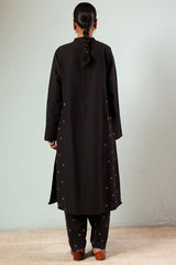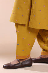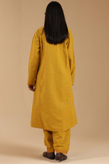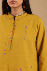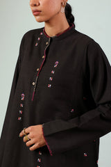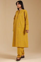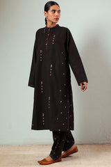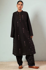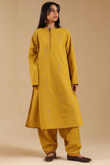 Embroidered paneled kurta with a low band neckline and a buttoned front placket, adorned with delicate stitching details along the neckline, slit, and sleeve hems. Paired with an embroidered classic-fit shalwar.