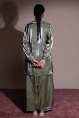A sleek, luxe-finish classic-fit shirt featuring a soft V-neckline with scalloped detailing along the neckline, sleeve hems, and shirt hem. Paired with flared trousers finished with scalloped hems for an elegant, festive look.