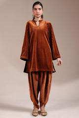 Luxurious textured velvet shirt with a low band neckline and a v-slit, adorned with delicate bead embellishment. Paired with matching tulip-style velvet shalwar for an elegant, festive look.