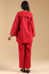 Hand-embroidered classic-fit shirt with detailed embroidery along the neckline, yoke, and sleeve hems. Paired with matching culottes finished with embroidered accents.