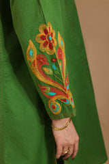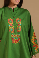 An embroidered paneled kurta with a low band neckline, adorned with colorful stitch detailing and buttons along the front placket. Paired with straight-fit trousers for an elegant, composed look.