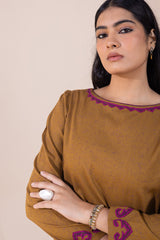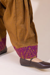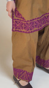 A classic-fit shirt on a speckled base, designed with a round neckline and puff sleeves, and adorned with patchwork and embroidered detailing. Paired with a matching classic-fit shalwar.