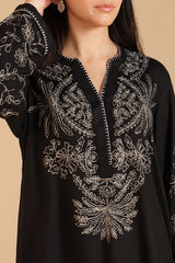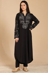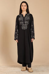 Monotone embroidered shirt with a round neckline and V-slit, finished with delicate stitch detailing along the neckline and sleeve hems. Paired with straight-fit trousers.